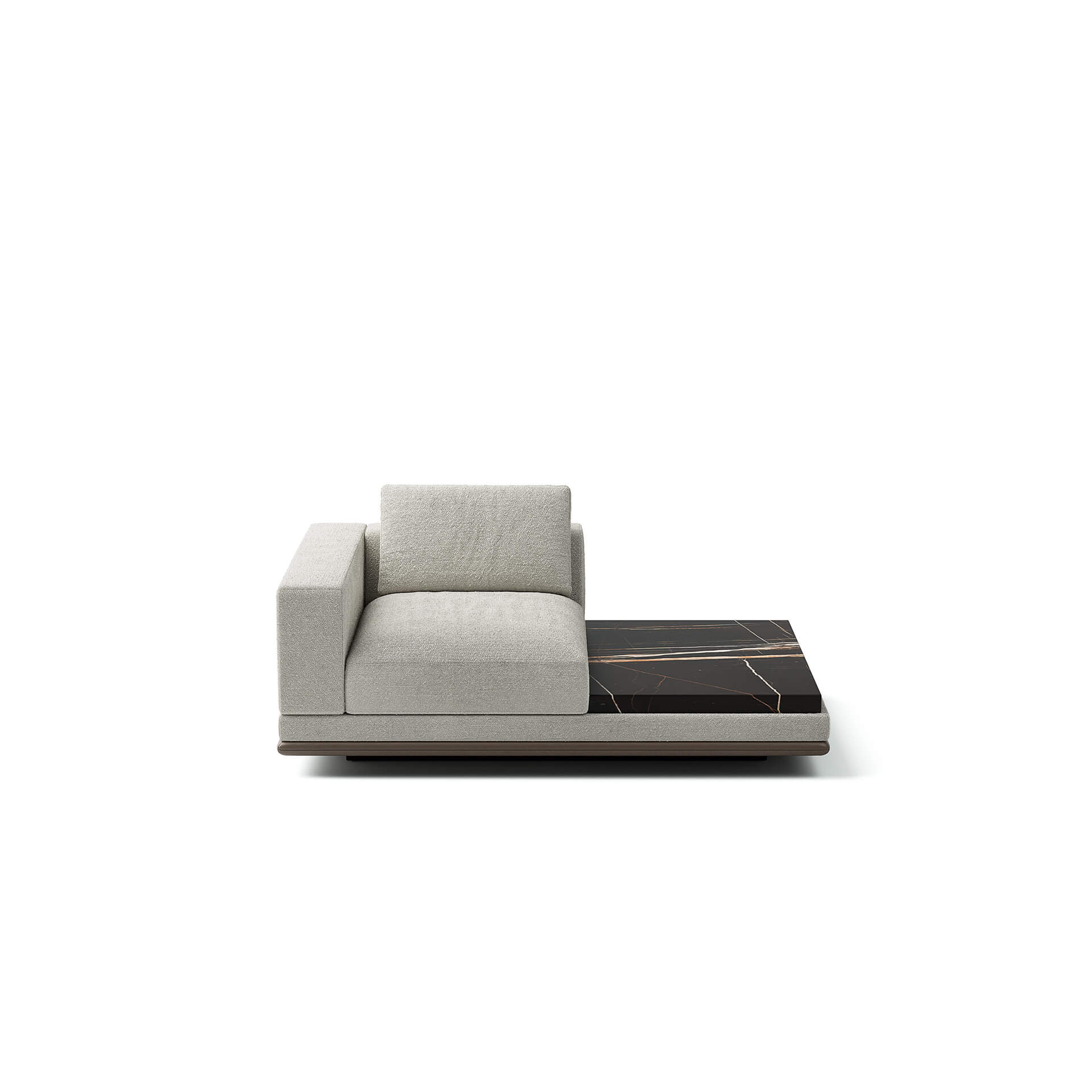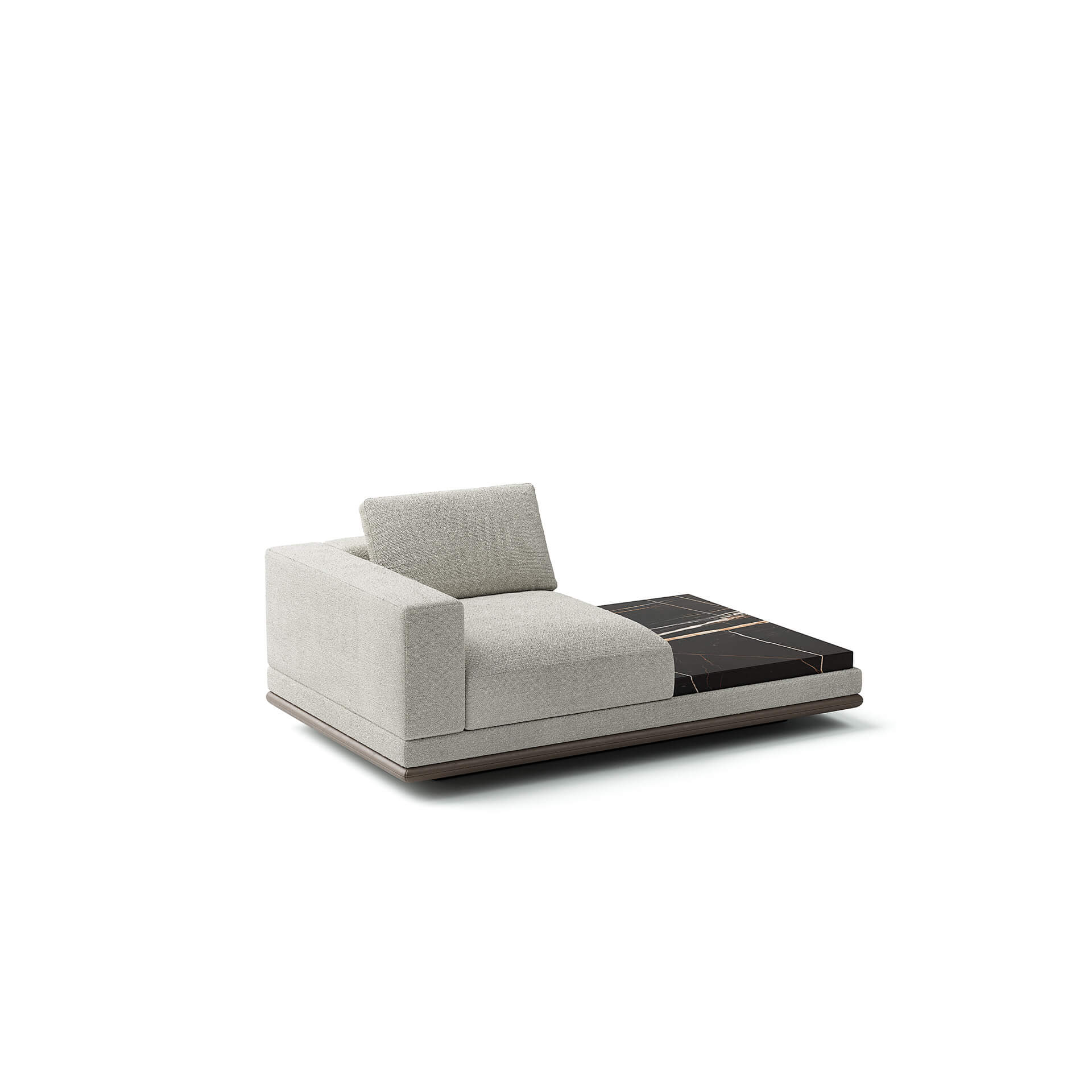 Struttura in legno. Imbottiture con schiumati a densità variabile. Cuscini seduta e schienale sfoderabili, schienale in piuma d’oca rigenerata. Base in legno scuro. Piano in appoggio in essenza, laccato o marmo.