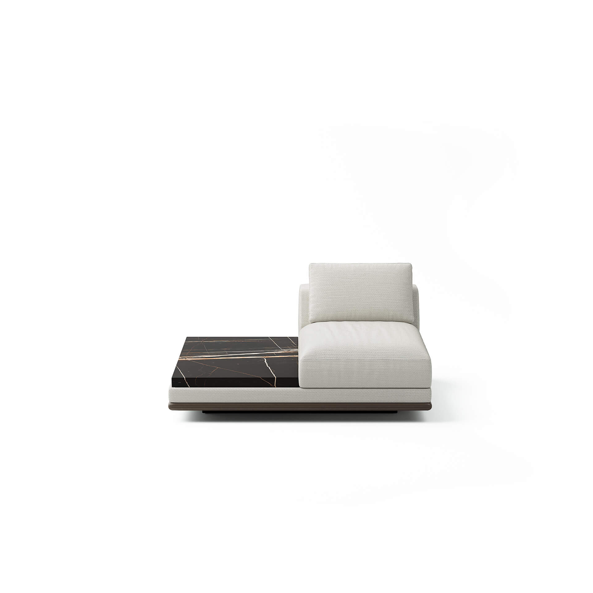 Struttura in legno. Imbottiture con schiumati a densità variabile. Cuscini seduta e schienale sfoderabili, schienale in piuma d’oca rigenerata. Base in legno scuro. Piano in appoggio in essenza, laccato o marmo.