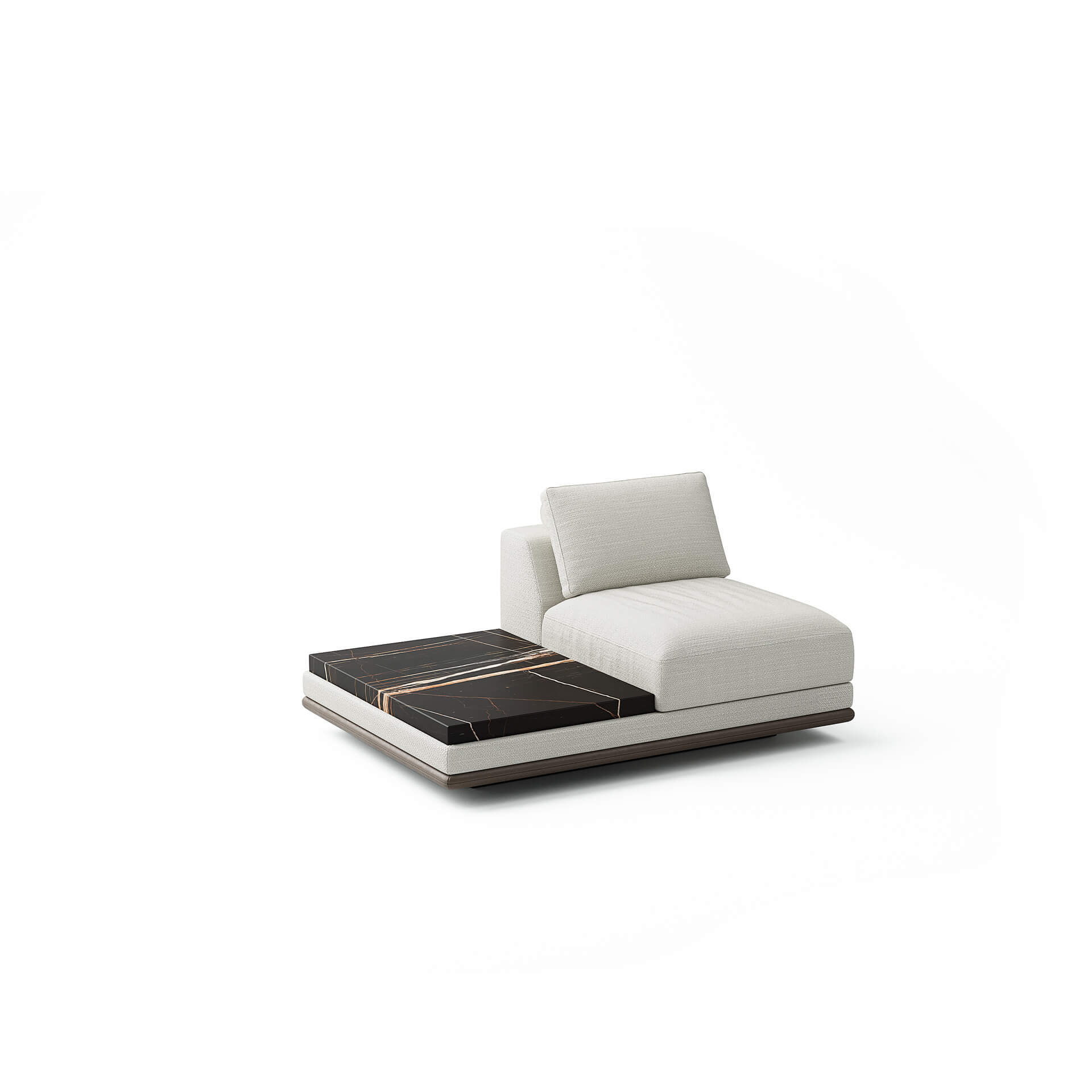 Struttura in legno. Imbottiture con schiumati a densità variabile. Cuscini seduta e schienale sfoderabili, schienale in piuma d’oca rigenerata. Base in legno scuro. Piano in appoggio in essenza, laccato o marmo.